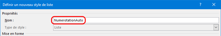 3. Nommez votre système de numérotation, par exemple ici, NumerotationAuto :