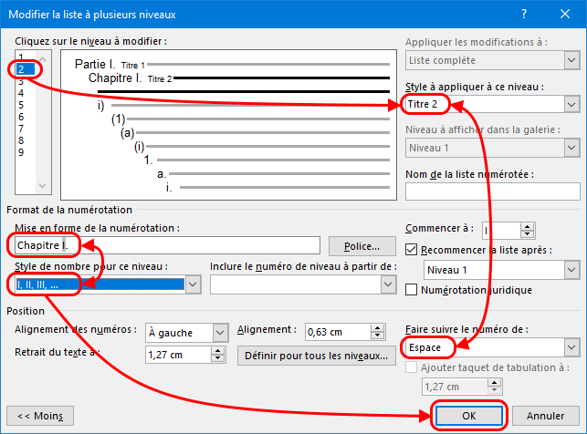 8. Passez maintenant au niveau 2. Dans la barre de saisie, tapez le mot « Chapitre » et définissez le format de nombre en chiffres romains (I,II,III, …). Ajoutez un point après le numéro.