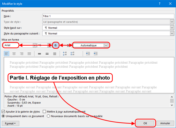 3. Paramétrez la mise en forme du style Titre 1 comme vous le souhaitez. Dans notre exemple, nous modifions la police vers Arial, nous appliquons les caractères gras et la couleur Automatique (noir).