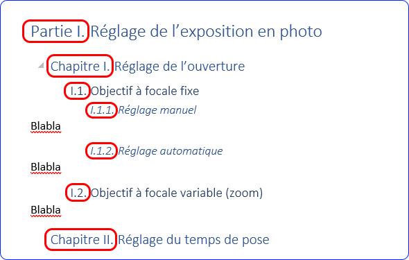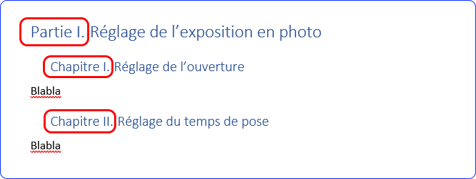 Il est possible de paramétrer Word pour que les titres de vos parties soient automatiquement précédés d’un numéro ou d’une expression, par exemple :