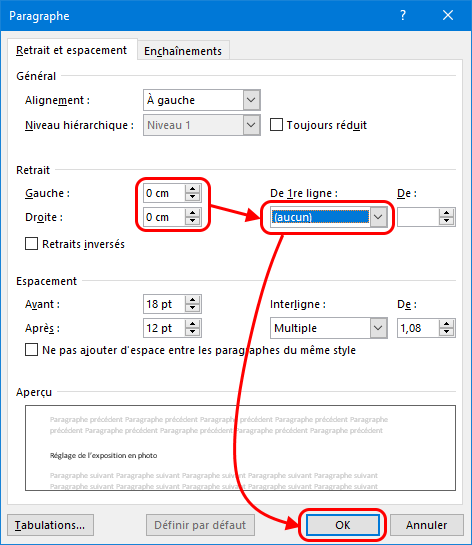 4. Allez ensuite dans Format > Paragraphe, puis supprimez le retrait existant.