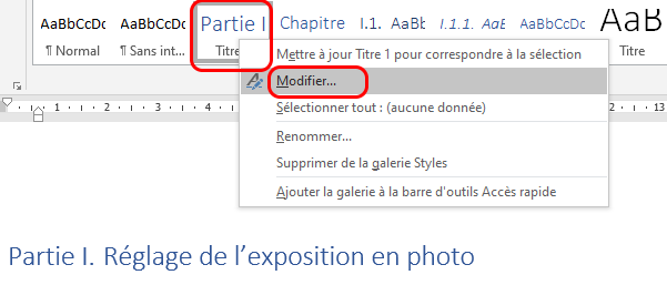 2. Dans la barre des styles, faites un clic droit sur le style Titre 1 et choisissez Modifier :