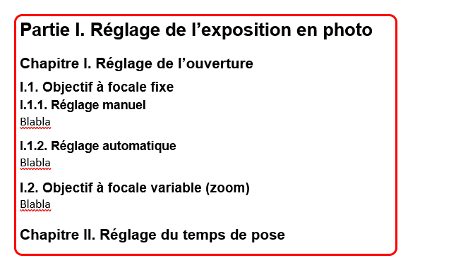 Par exemple, votre travail pourra se décomposer en Parties, elles-mêmes décomposées en Chapitres, eux-mêmes en sections numérotées de type I.1, I.2, et ainsi de suite.