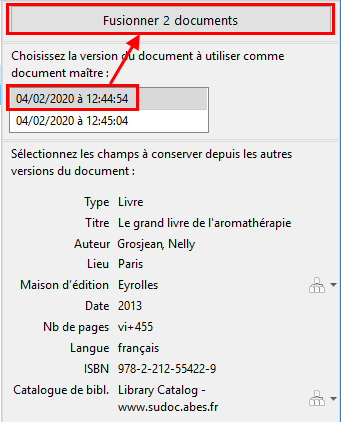 Vous pouvez maintenant sélectionner la version que vous souhaitez conserver (cliquez sur sa date), puis cliquer sur Fusionner 2 documents.