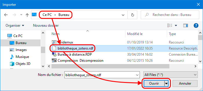 Dans la fenêtre suivante, allez chercher le fichier que vous avez précédemment exporté de Zotero et cliquez sur Ouvrir :