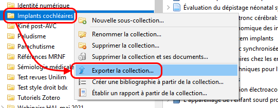 Sélectionnez votre bibliothèque ou le dossier que vous souhaitez exporter, puis faites un clic droit > Exporter la bibliothèque… ou clic droit > Exporter la collection… :