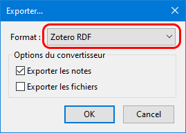 - Zotero RDF si vous souhaitez transmettre votre bibliothèque à un autre utilisateur de Zotero