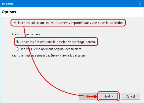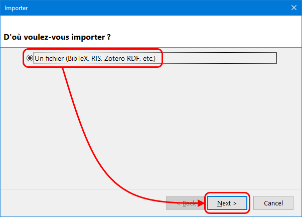 Dans la boîte de dialogue suivante, laissez coché Un fichier (BibTeX, RIS, Zotero RDF, etc.) et cliquez sur Next :