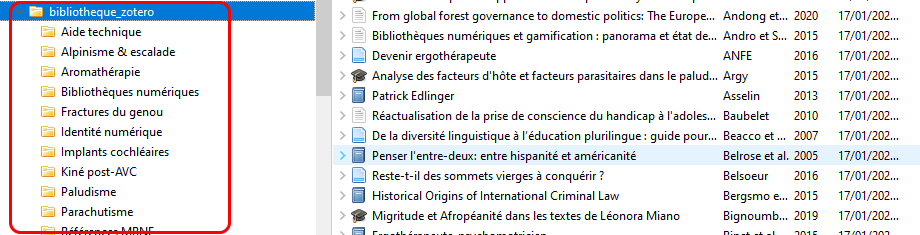 La procédure d’importation est maintenant terminée, la bibliothèque importée apparaît dans un nouveau dossier de la bibliothèque destinataire, avec ses sous-dossiers éventuels et toutes les références récupérées :