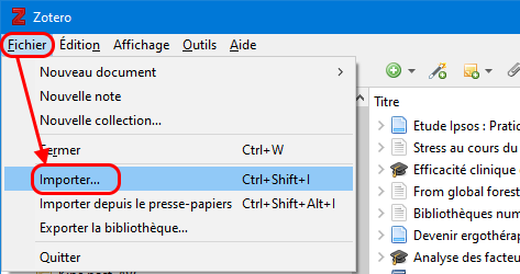 Sur l’ordinateur de la personne destinataire, ouvrez Zotero, puis le menu Fichier > Importer… :