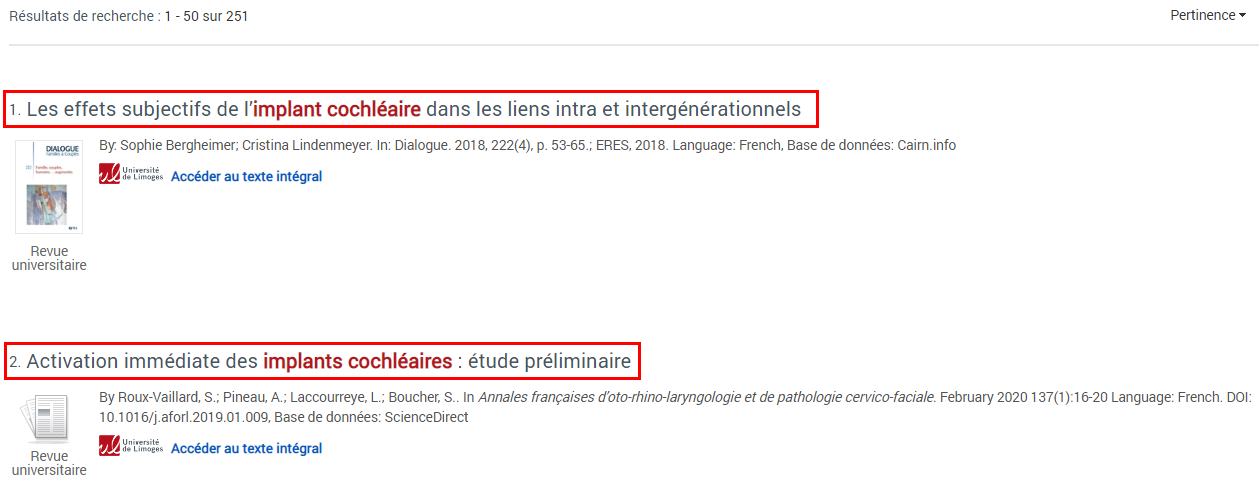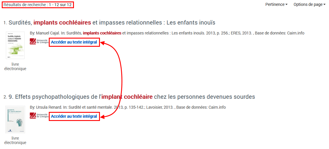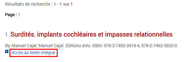 Dans l’interface de recherche, sélectionnez l’onglet Livres en ligne, puis tapez votre titre (ici, Surdités, implants cochléaires et impasses relationnelles) et lancez la recherche :