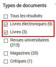 Sous la rubrique Types de documents, cochez les cases Livres (= livres disponibles sur papier et en ligne) et Livres électroniques (= livres disponibles uniquement en ligne) :