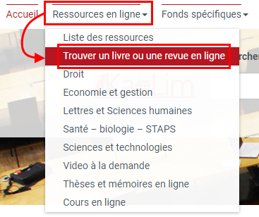 Sur le site web du SCD, ouvrez le menu Ressources en ligne > Trouver un livre ou une revue en ligne :