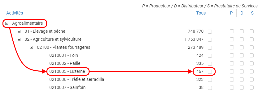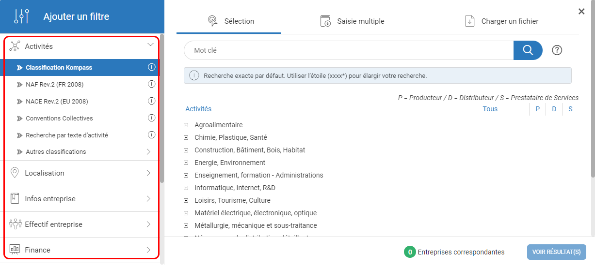 La classification Kompass permet de cibler précisément le secteur d’activités recherché. Vous pouvez cocher soit la catégorie générale, soit une sous-catégorie plus précise :