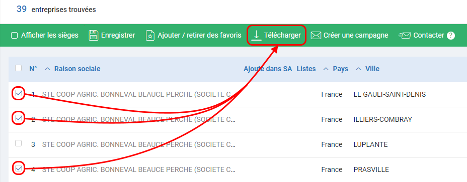 A partir de la liste des résultats, vous pouvez exporter la liste complète ou une sélection d’entreprises (format Excel, CSV ou PDF). Cochez les entreprises souhaitées et cliquez sur le bouton Télécharger :