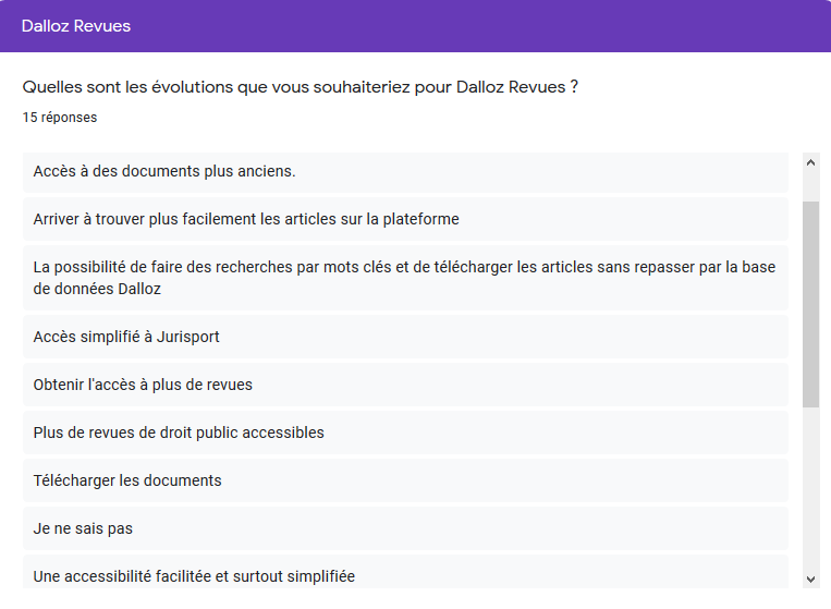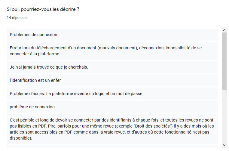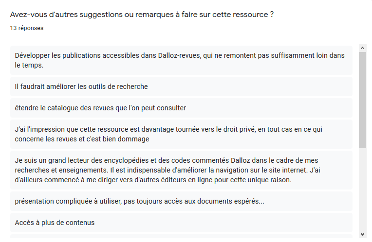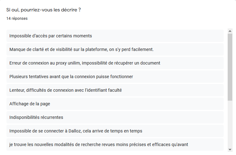 Actuellement, ce sont les abonnements auprès de Dalloz et LexisNexis qui arrivent à échéance. Rassurez-vous, la question d’une reconduction ne se pose pas a priori. Nous savons que ces ressources sont indispensables à nombre d’entre vous. Cependant nous avons souhaité recueillir votre avis sur ces ressources dans le but de communiquer au Consortium Couperin vos besoins. De cette manière, les négociations entre le Consortium et ces éditeurs seront enrichies de vos attentes.