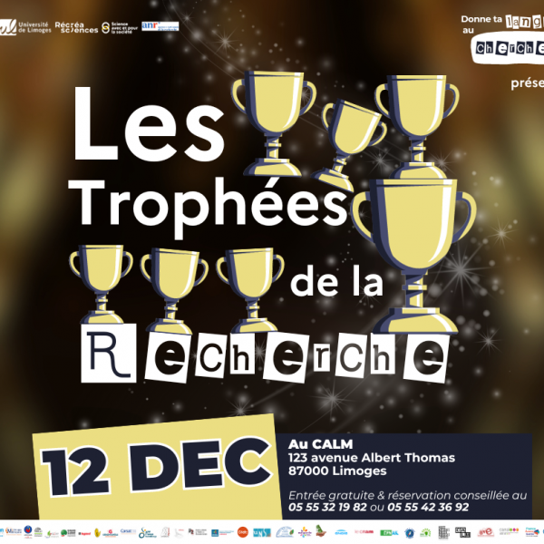 Une nouvelle session de Donne ta langue au chercheur spéciale Les Trophées de la Recherche s’est tenue le mardi 12 décembre 2023 au CALM. Les projets portés par l’Université de Limoges en 2020 et labellisés par l’Agence Nationale de la Recherche (ANR) ont été mis sous les feux des projecteurs le temps d’une soirée.