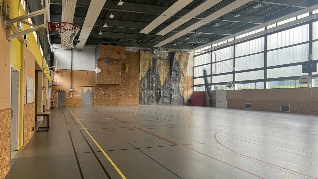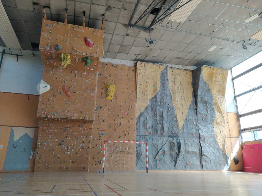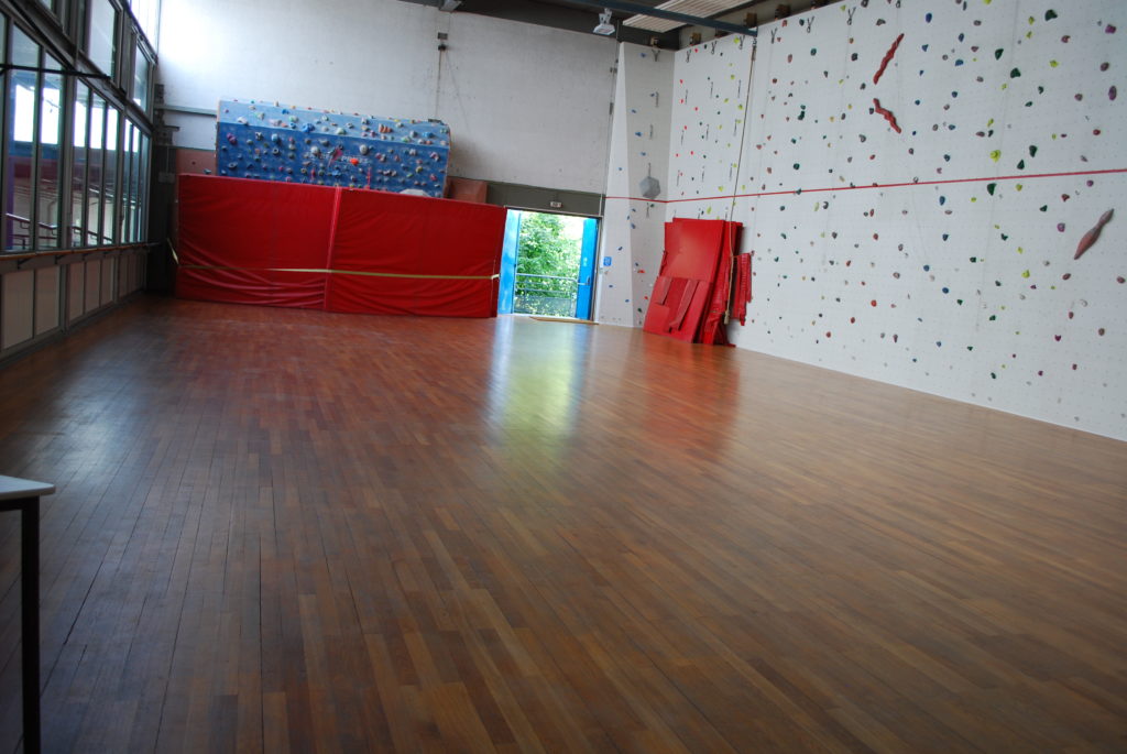 Revêtement plancher bois. Escalade : pan inclinable (structure inclinable) et mur (10 voies, 3/4a au 6b).