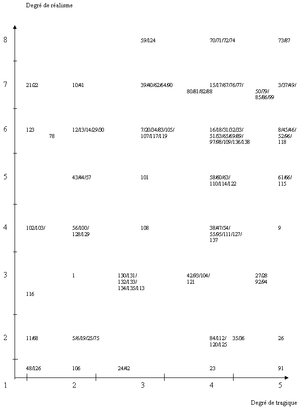 Pour classer les œuvres en fonction de leur actualisation du registre tragique, cinq niveaux ont été dégagés.