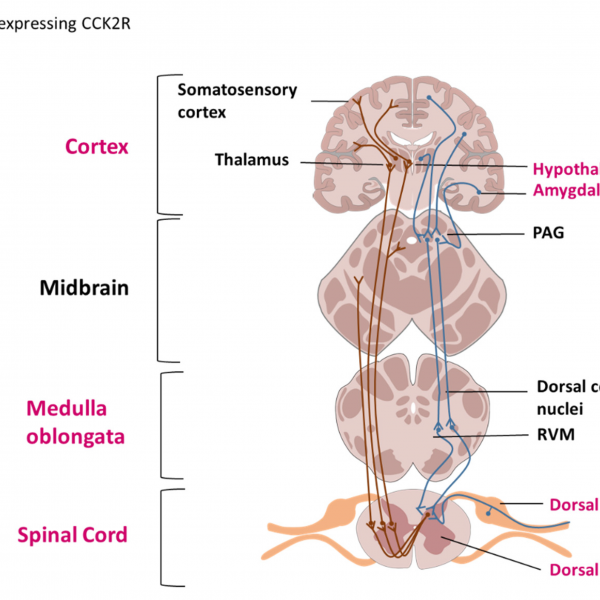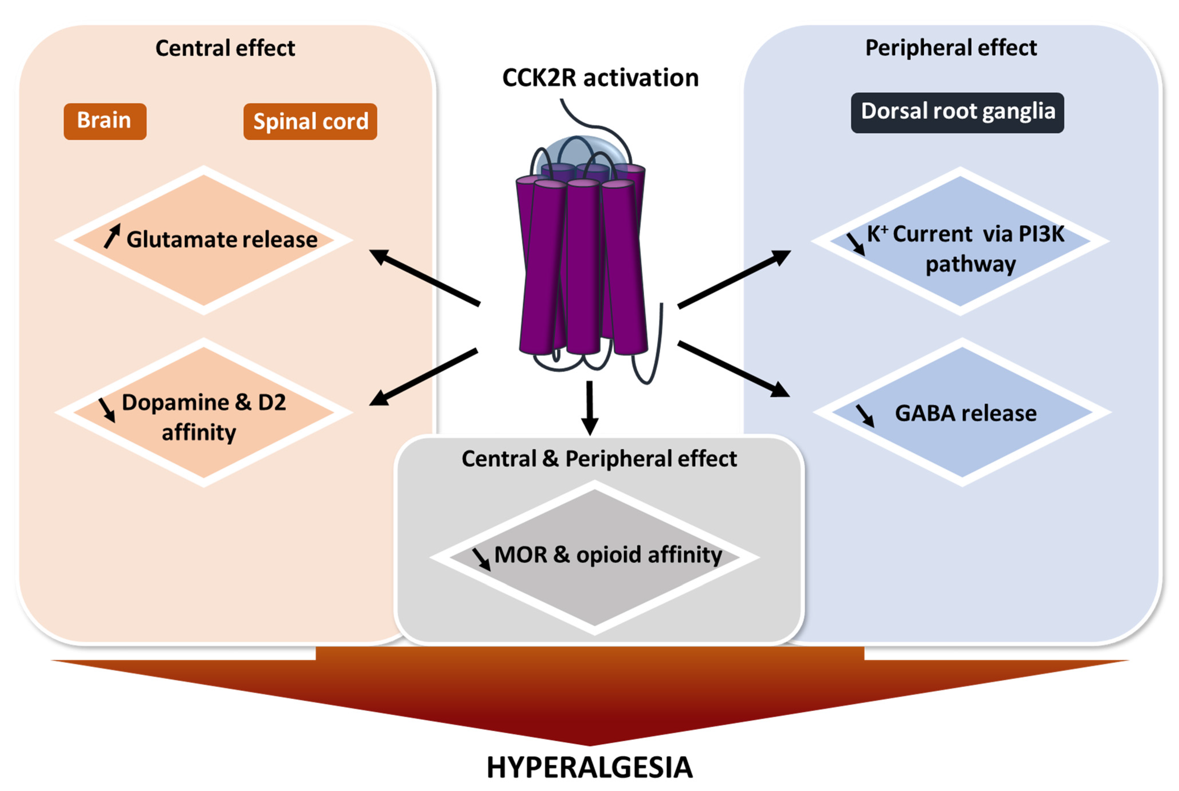 En effet, des preuves s’accumulent depuis ces dernières décennies pour démontrer le rôle du CCK2R dans la modulation de la douleur. L’activation de CCK2R dans la nociception a conduit au développement de plusieurs antagonistes qui se sont avérés capables de soulager la douleur dans plusieurs modèles de rongeurs. Cependant, les résultats des essais cliniques sont plus modestes car ils n’ont pas démontré l’effet obtenu chez l’animal.