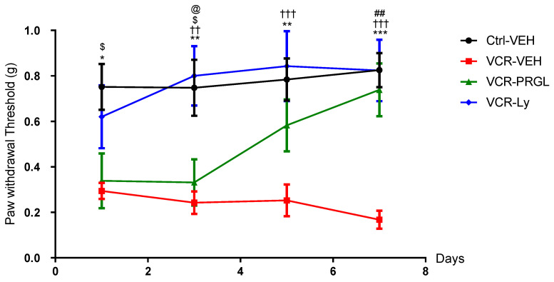 De ce fait, l’effet du blocage du CCK2R sur l’apparition de la NPIV a été évaluée ainsi que son interaction avec l’efficacité anticancéreuse de la vincristine. Pour cela, différents antagonistes ont été administrés : le proglumide et le Ly225910, puis la sensibilité tactile a été évaluée pendant les traitements et des analyses morphologiques ont été réalisées sur la peau, les DRG et le nerf sciatique.