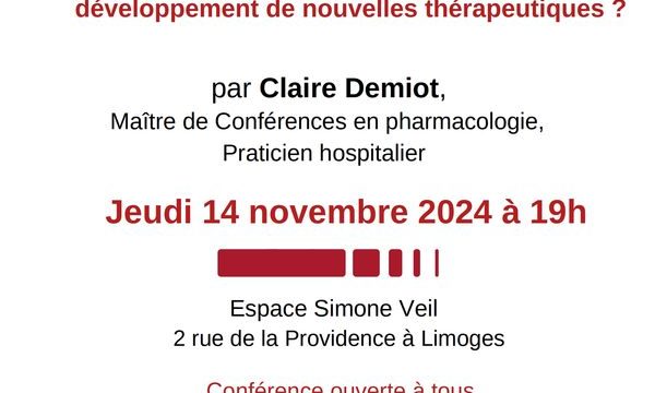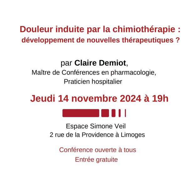 Dans le cadre des conférence grand public de l’université de Limoges, le Dr Claire Demiot anime la conférence « Douleur induite par la chimiothérapie : Développement de nouvelles thérapeutiques ? » à l’Espace Simone Veil le 14 novembre 2024.
