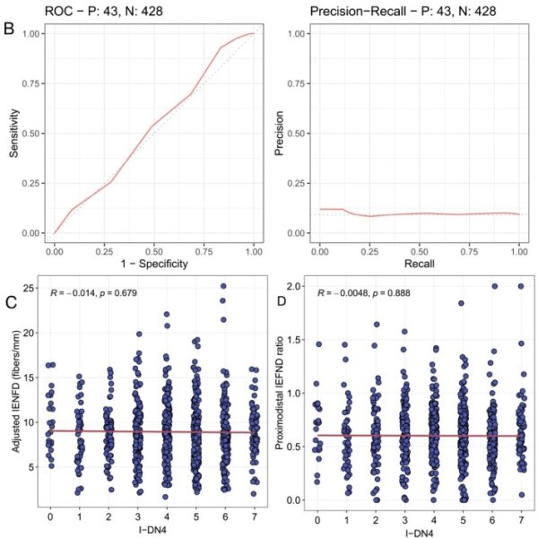 Cette étude rétrospective a examiné la précision diagnostique de l’auto-questionnaire Douleur Neuropathique 4 (I-DN4) pour la neuropathie à petites fibres chez 872 patients qui ont été évalué au moment de la biopsie cutanée selon les normes de soins de routine.