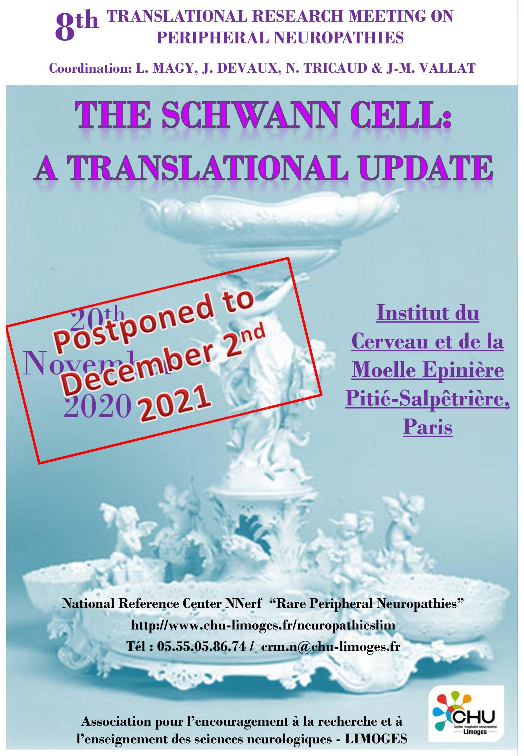 Le « 8th Translational Research Meeting on Peripheral Neuropathies » organisé par notre Centre de Référence NNerf du CHU de Limoges initialement prévu le 20 novembre 2020 se déroulera le 2 décembre 2021 à l’Institut du Cerveau et de la Moelle Epinière de la Pitié-Salpétrière à Paris.