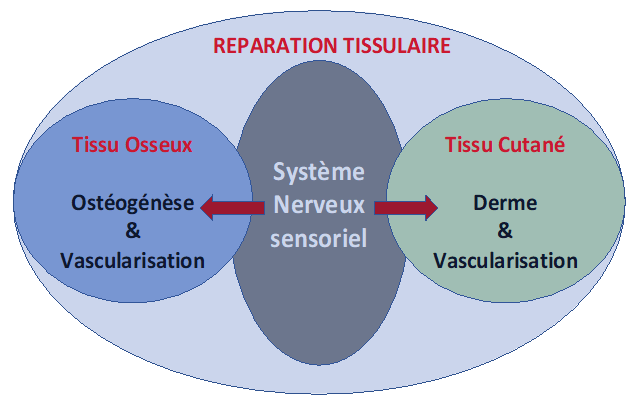 Bien que différents par la nature de leur matrice extracellulaire, par leurs propriétés mécaniques et par leur fonction, ces deux tissus sont cependant tous deux suceptibles d’être sous le contrôle du système nerveux sensoriel et des mécanismes d’angiogénèse. Des travaux récents ont démontré l’intérêt des relations neuro-conjonctives dans le contrôle de la répération/régénération cutanée et osseuse par le système nerveux sensoriel. Il reste à démontrer l’orchestration et la cinétique de ces évènements impliquant les relations cellules neuronales – tissus conjonctifs dans un contexte de réparation/régénération tissulaire.