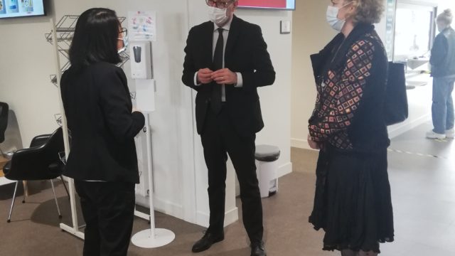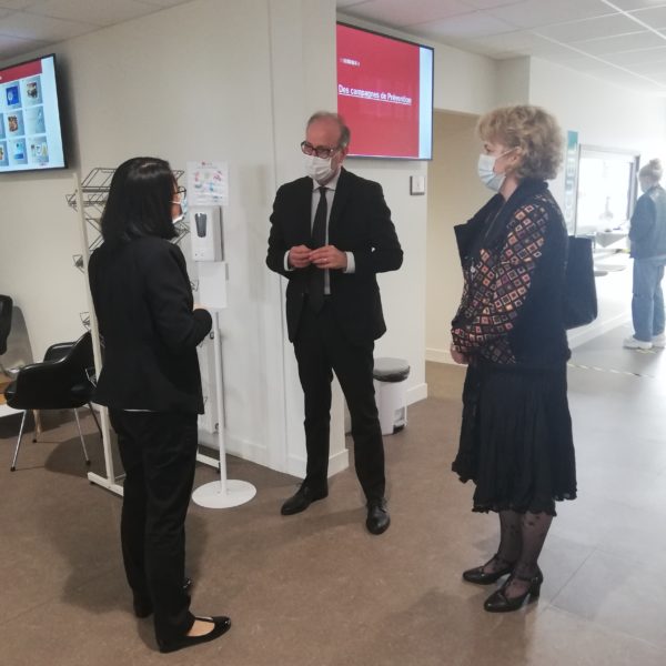 Le Recteur a visité le Service de Santé Universitaire (SSU) de Limoges où il a pu rencontrer la directrice du service, Rosalie VANG et la psychiatre Aline MENARD, pour échanger sur le dispositif de tests de dépistage et sur la prise en charge psychologique des étudiants de l’université de Limoges. Le recteur a également pu écouter les témoignages de la Vice-Présidente « Vie des campus », Barbara BESSETTE, et des étudiants tuteurs d’accompagnement COVID ; il a discuté avec le Président de l’association ETUTEL, Alexandre LIOT, qui lui a fait part des actions de l’association au quotidien.