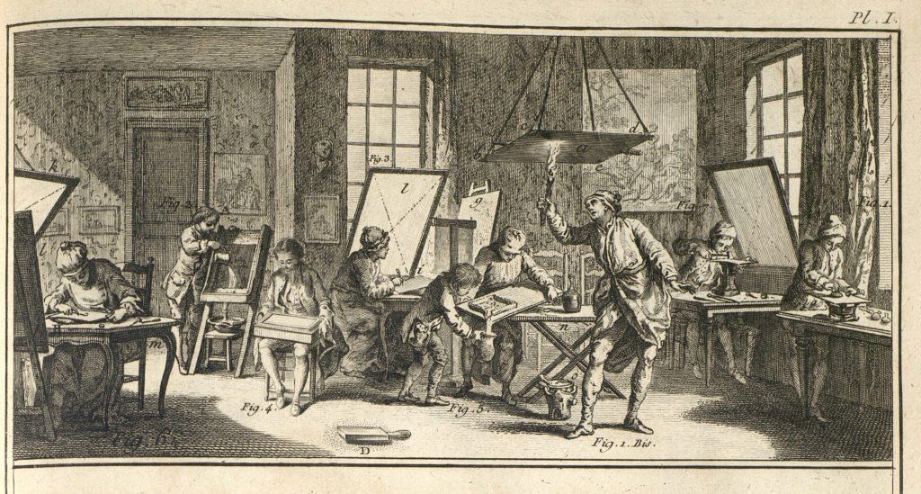 Encyclopédie, ou Dictionnaire raisonné des sciences, des arts et des métiers, par une société de gens de lettres ; mis en ordre et publié par M. Diderot,… Et, quant à la partie mathématique, par M. d’Alembert,… Paris : Briasson, David, Le Breton, etc…1751-1777. -35 vol. ; in-fol. – Planches : Tome 5, gravure en taille douce.