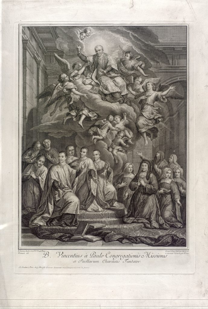 La Congrégation de la Mission (ou prêtres Lazaristes) a pour origine le sermon prononcé par Vincent de Paul le 25 janvier 1617, du haut de la chaire de l’église de Folleville (Somme). Sa protectrice, Marie-Françoise de Silly, généralise la confession sur l’ensemble des terres de son mari Philippe-Emmanuel de Gondi, convaincue par la joie immense d’un malade à qui Vincent de Paul vient d’accorder le pardon. Peu avant sa mort en 1625, elle lui alloue une rente et le collège des Bons-Enfants à Paris. En 1632, Vincent de Paul, par l’intermédiaire du cardinal de La Rochefoucauld, s’installe dans le prieuré de Saint-Lazare, origine du nom usuel de « Lazaristes » pour ses prêtres. L’année suivante, Vincent de Paul, devenu « Monsieur Vincent », est reconnu de tous : du roi qui lui concède ses lettres patentes pour sa congrégation ; de Richelieu, qui lui demande des missions ; de l’archevêque de Paris, Jean-François de Gondi, qui utilise les prêtres de la Mission partout où il l’estime nécessaire ; et du pape Urbain VIII qui lui délivre sa bulle de reconnaissance.