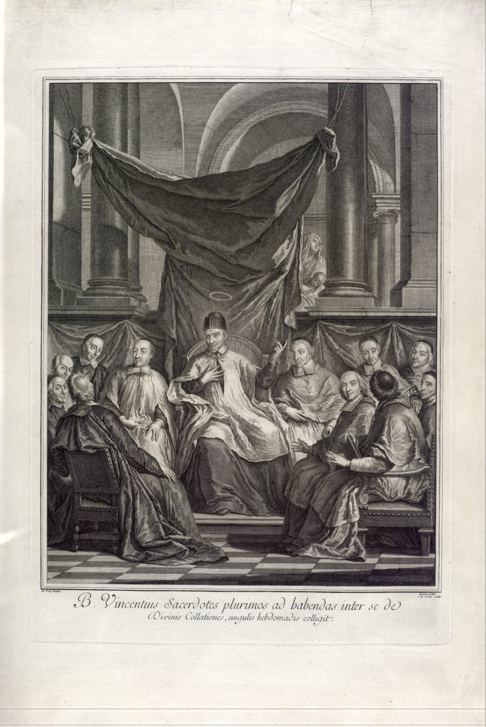 Lorsque Vincent de Paul commence à organiser les « Conférences des mardis » en 1633, la formation des prêtres est une préoccupation majeure depuis le Concile de Trente. Elles ont pour origine à la fois la volonté des évêques de Beauvais et Paris d’exercer les ordinants, et l’obligation faite aux Lazaristes de suivre une conférence spirituelle hebdomadaire. Au fil du temps, leurs débats s’élargissent à tous les prêtres qui souhaitent faire une retraite à Saint-Lazare. Il ne s’agit pas d’écouter passivement un exposé, mais de mettre en commun les réflexions sur le thème précis du jour, sous la présidence de Vincent de Paul. De toutes les oeuvres qu’il a créées, les Conférences sont celles où son rayonnement et son charisme se remarquent le plus.